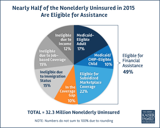 Weeks away from the Affordable Care Act’s third open enrollment period, a new Kaiser Family Foundation analysis finds nearly half (49% or 15.7 million) of the 32.3 million nonelderly people in the United States without health insurance at the beginning of 2015 are eligible for Medicaid or subsidized coverage through an ACA marketplace.