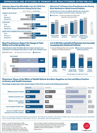 Based on a survey of primary care clinicians in early 2015, this Visualizing Health Policy infographic examines the experiences and attitudes of primary care practitioners (PCPs) after the Affordable Care Act’s (ACA’s) major coverage provisions took effect in January 2014. Although most report no change in their ability to provide quality care, their opinions about the health care law are sharply divided along political party lines. Generally, primary care physicians have a more negative view of health reform’s effect on the cost of patient care, but a more positive view of the law’s impact on patient access to health care and insurance. About 6 of 10 primary care clinicians say they’re seeing more newly insured patients or patients covered by Medicaid since the ACA’s major coverage provisions took effect in January 2014. Large shares—66% of nurse practitioners and physician assistants and 50% of physicians—report that they’re currently accepting new Medicaid patients.
